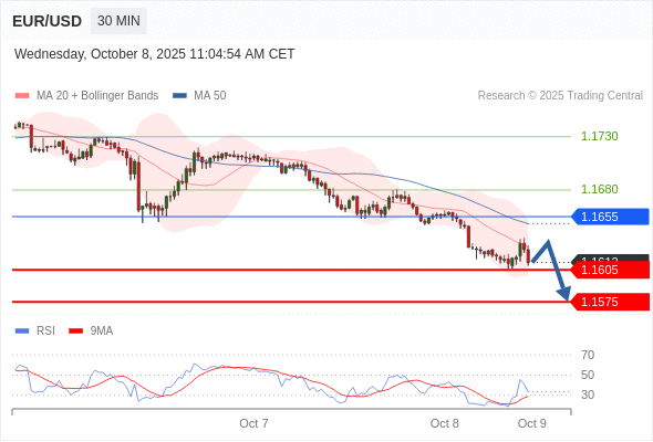 在 1.1655 之下,看跌,目标价位为 1.1605 ,然后为 1.1575 。