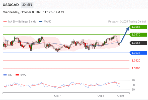 在 1.3935 之上,看涨,目标价位为 1.3970 ,然后为 1.3985 。