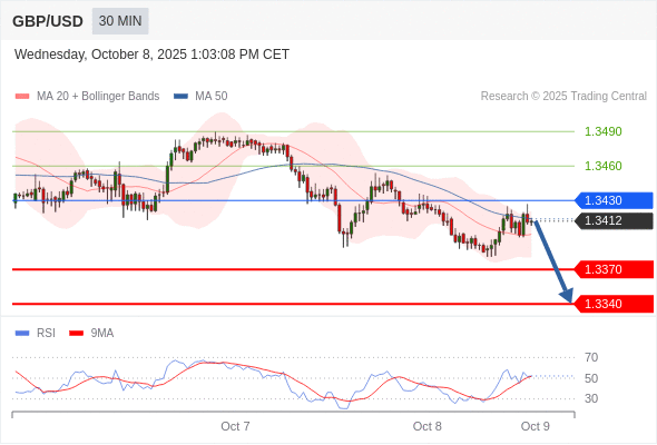 在 1.3430 之下,看跌,目标价位为 1.3370 ,然后为 1.3340 。
