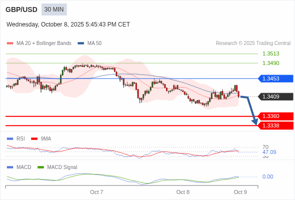 交易策略: 当 1.3453 维持阻力位时,存在回归 1.3338 的风险。