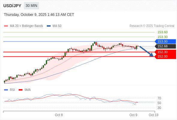 在 153.00 之下,看跌,目标价位为 152.30 ,然后为 152.00 。