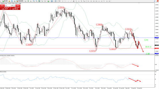 空头动力持续震荡下行,跌破布林带指标下轨附近节点后短暂回升, 但下行趋势持续,有继续向下移动态势,布林带指标呈张口走势中,上方压制关注中轨1.37769附近节点,低位支撑关注1.35289附近,关注下轨1.36107附近转折点,MACD指标处于0轴线下方空头区域维持整理下行,RSI指标处于50均衡线下方维持整理后有继续下行迹象,如图: