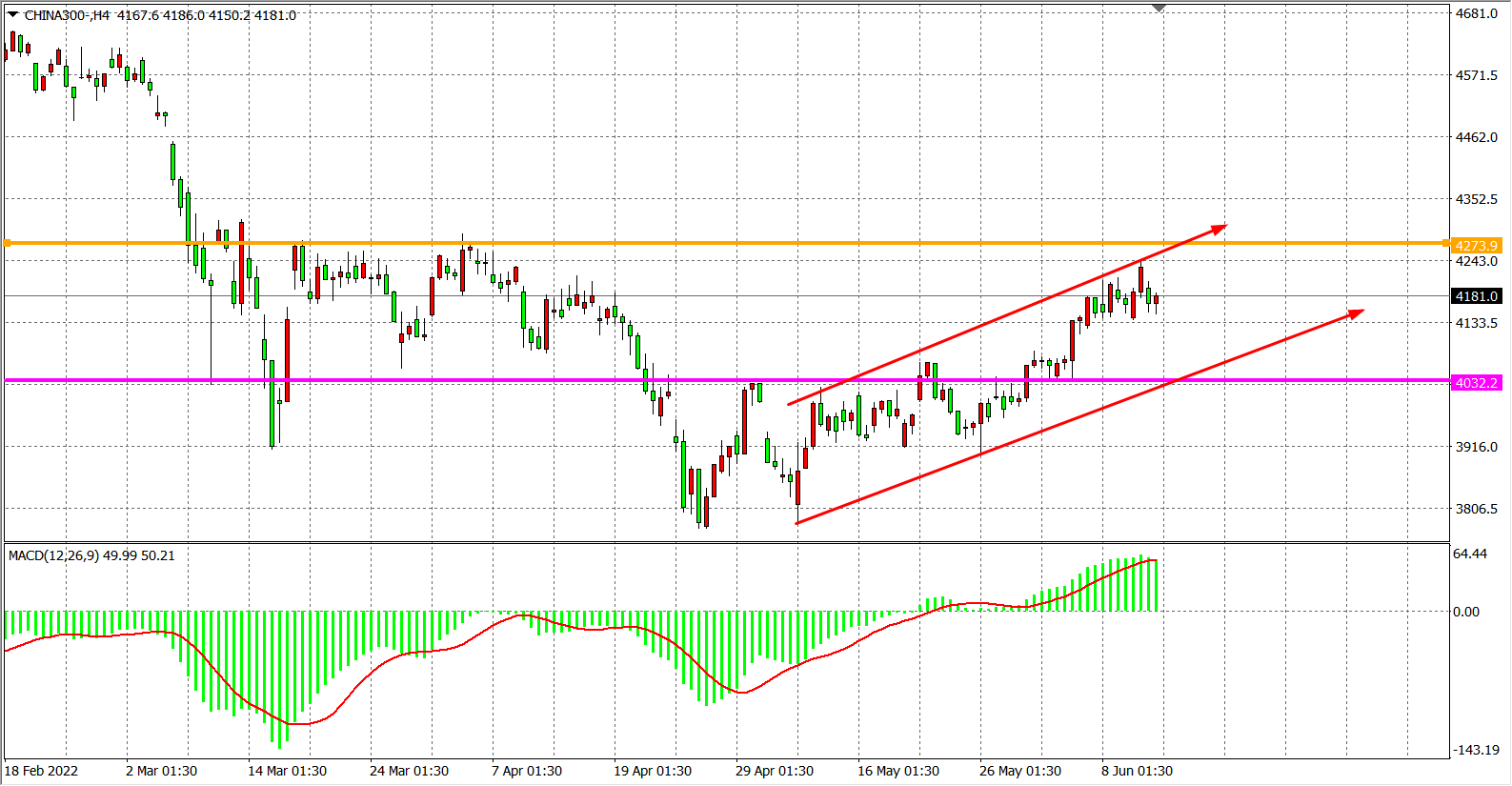 4小时图看,沪深300继续围绕4180形成拉锯,短期趋势再度陷入盘整震荡,MACD柱体并未出现大幅收缩,暗示多头动能仍旧较强,在调整完毕之后指数有望重拾涨势