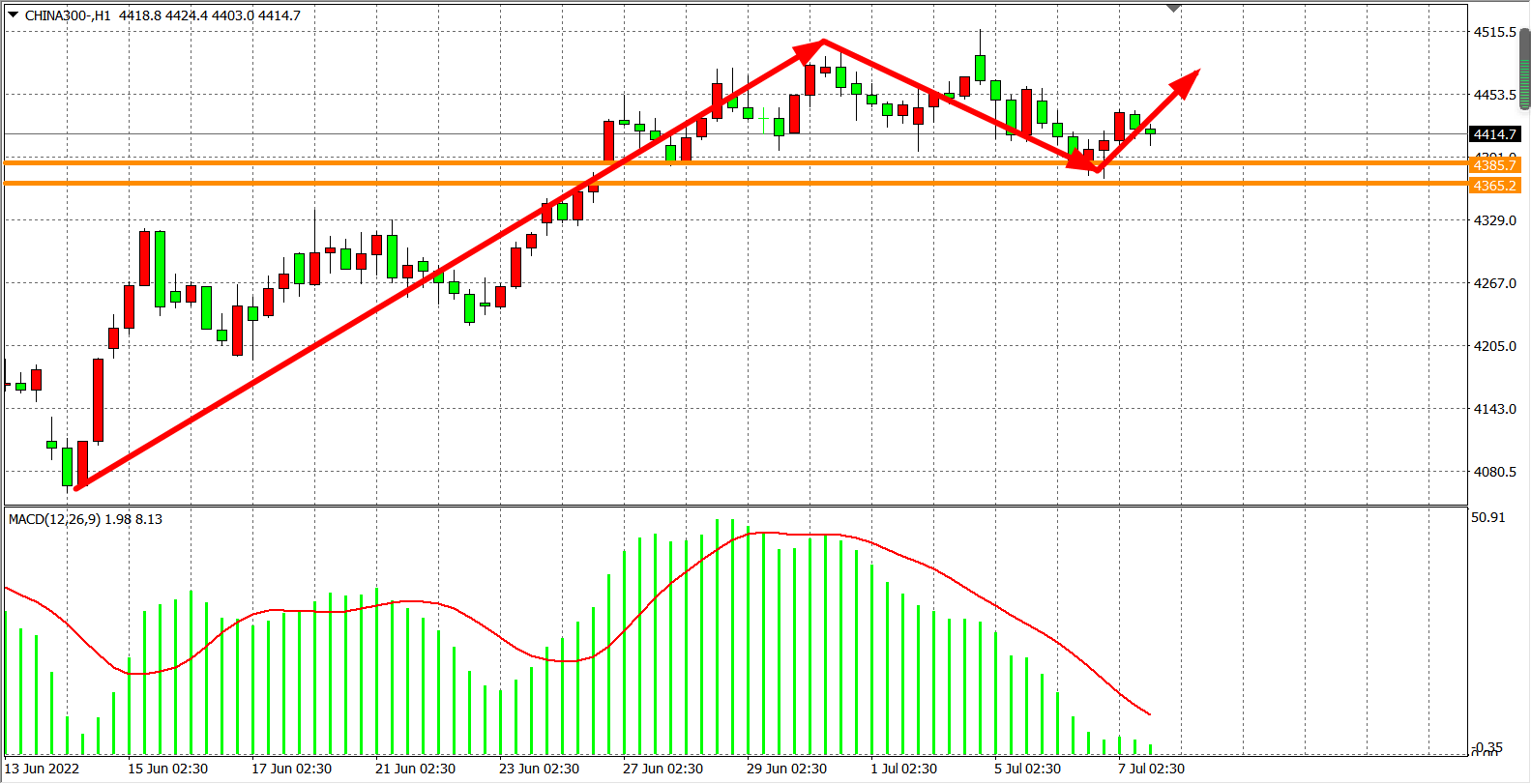1小时图看,沪深300再次回调4385-4365区域支撑后出现止跌,MACD在顶背离量能极具缩短后开始于零轴之上走平,预示行情或围绕支撑继续调整,日内在4365之上仍是多头趋势,下破4365才能确定趋势转空。日内重点关注4365,在此位之上仍以偏多头看待