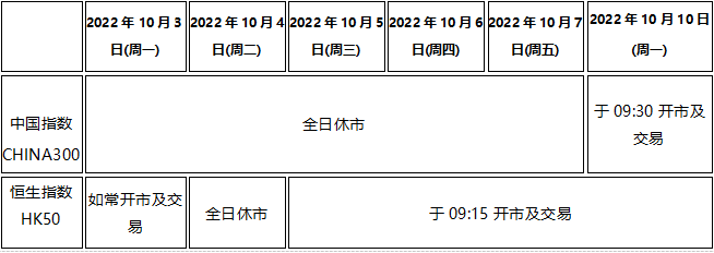 2022年10月1日至10月7日期间为国庆及重阳节假期,本公司以下产品的交易时间将于假期期间作以下安排,敬请留意。