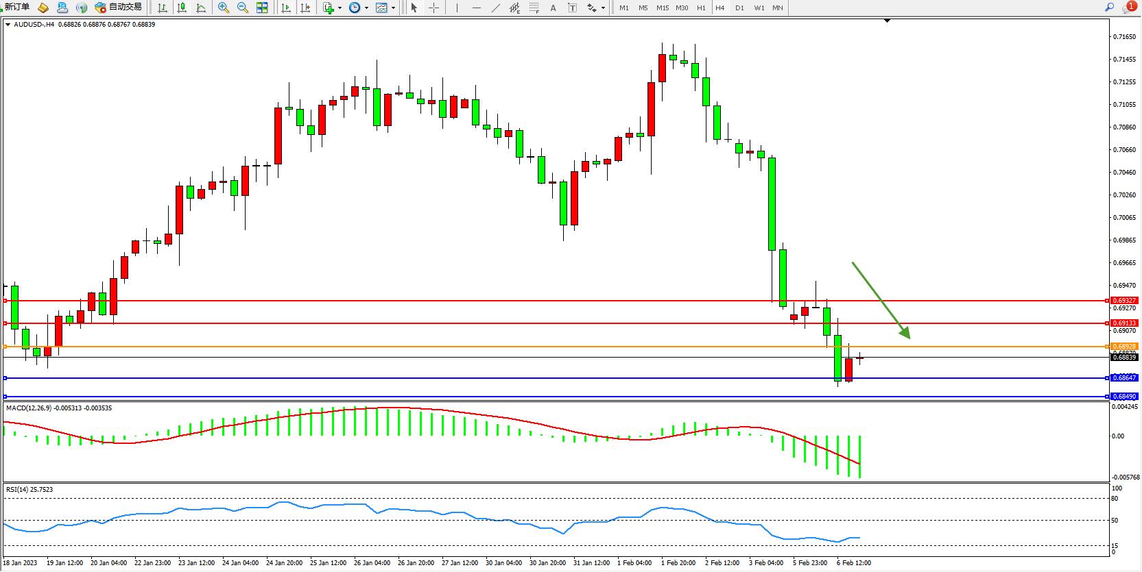 交易策略:0.68928下方看跌,目标0.68648、0.68490