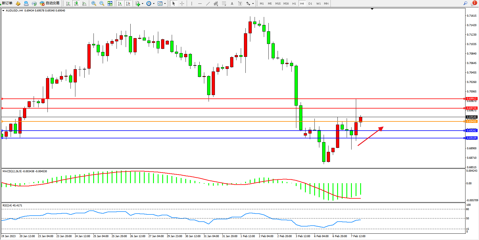 澳元兑美元维持0.69540附近震荡,新年首次利率决议,澳洲联储如期加息25个基点,将利率上调至3.35%,为2012年9月以来最高水平,自2022年4月以来已累计加息9次,共加息325个基点。