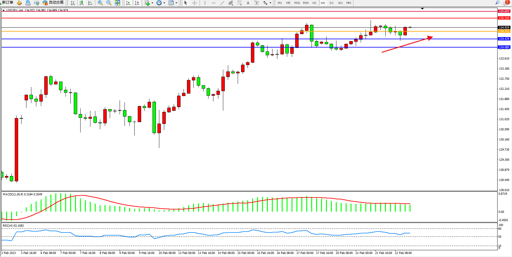 美元兑日圆维持134.929附近震荡,市场对美联储的终端利率预期继续攀升,而日本央行仍坚持维持货币宽松政策,利率差进一步扩大,这使得日元走弱。