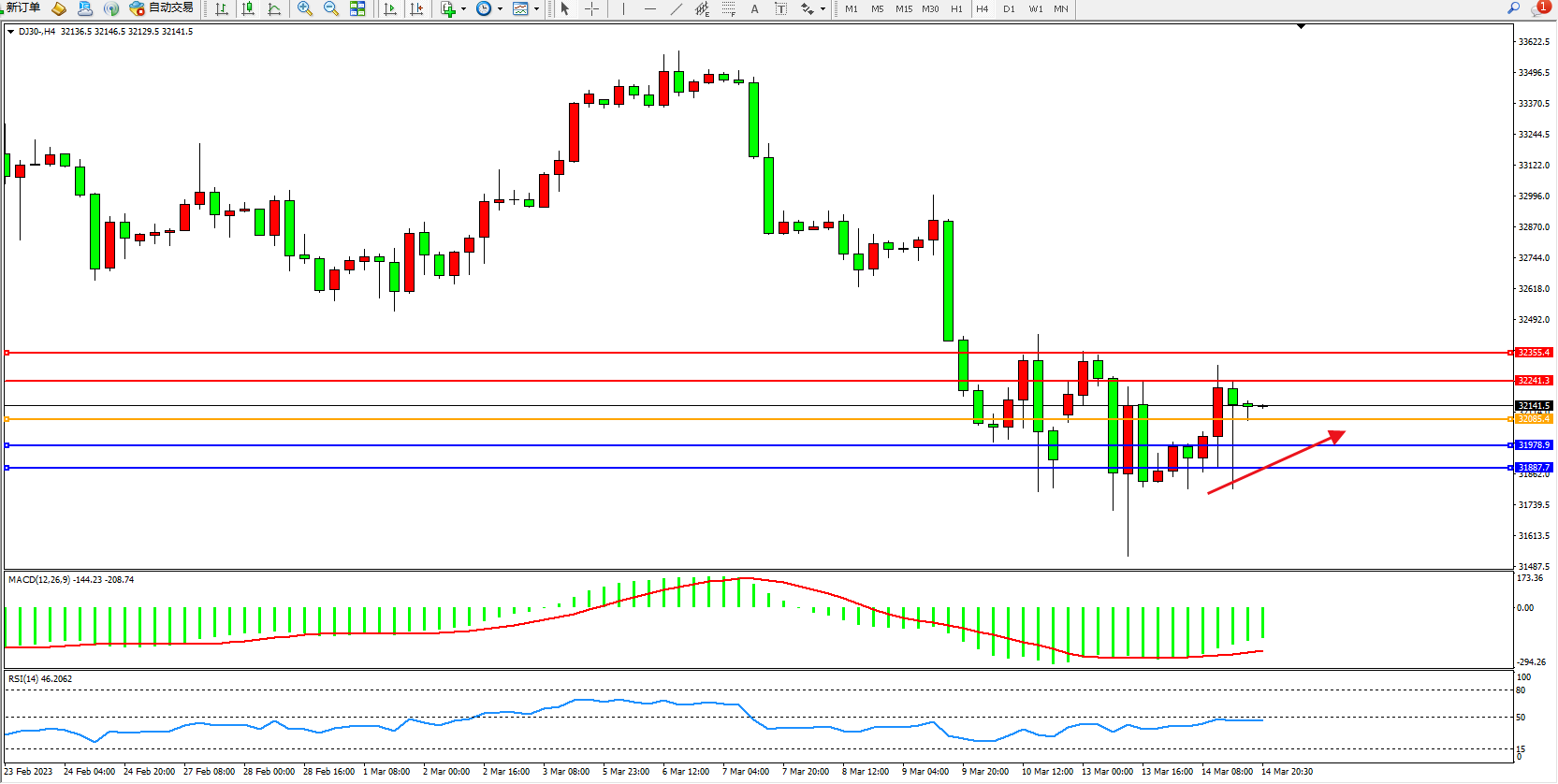 道琼斯指数3月14日(周二)收盘上涨334.75点,涨幅1.05%,报32153.89点;市场预计2月份整体和核心CPI环比将上涨0.4%,整体通胀同比将从6.4%降至6.0%。核心通胀同比将降至5.5%。