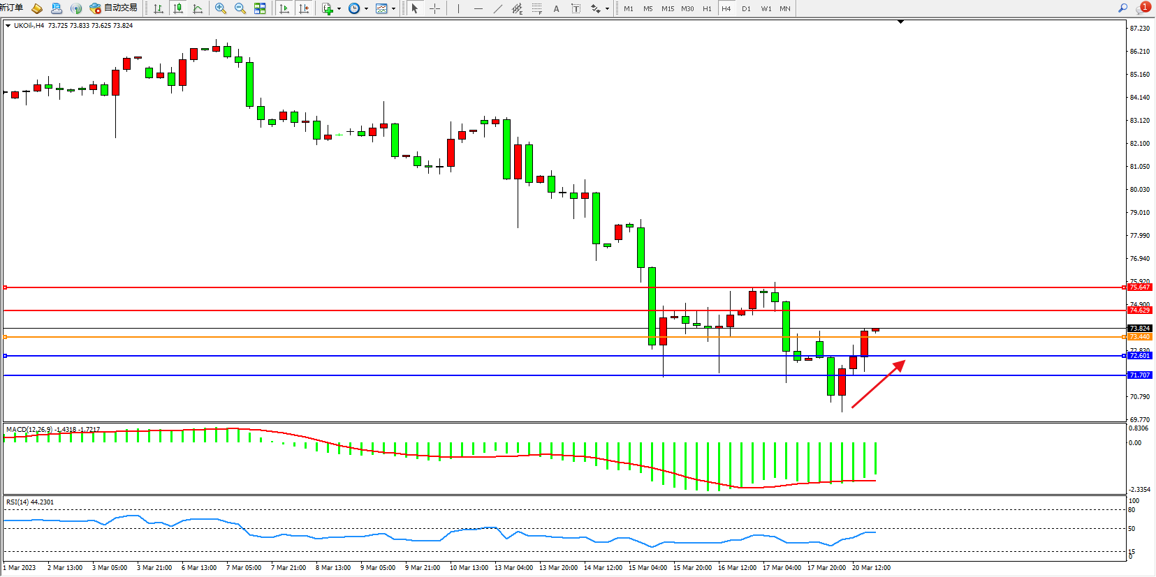 交易策略:73.440上方看涨,目标74.629  75.647