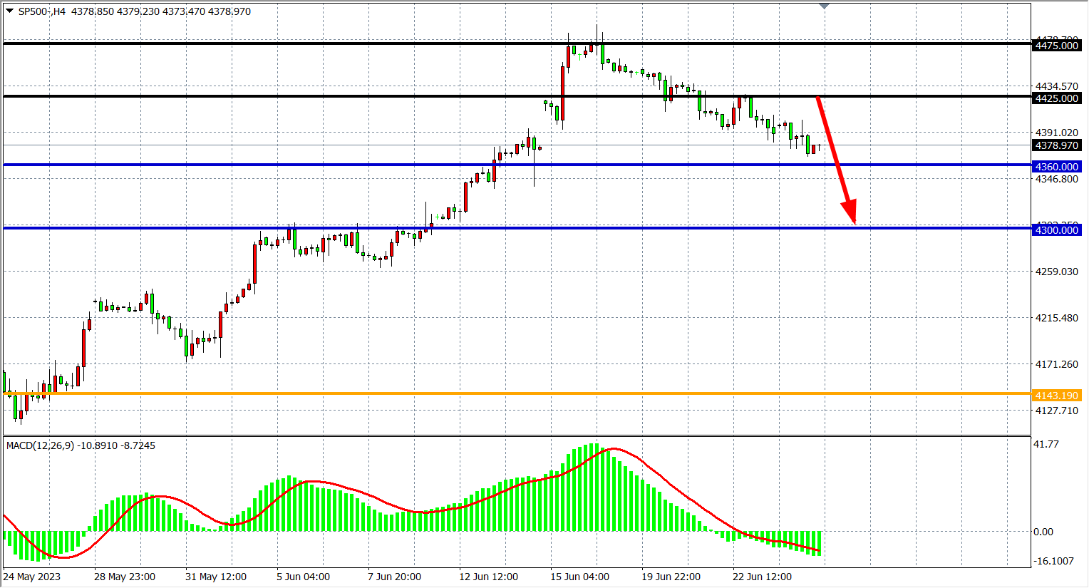 4小时图看,标普延续回落趋势,进一步下探至4370附近,MACD量能在零轴下小幅放量,行情延续跌势,下方支撑4360-4300,压力4425-4475。
