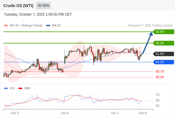 在 61.20 之上,看涨,目标价位为 62.20 ,然后为 62.80 。